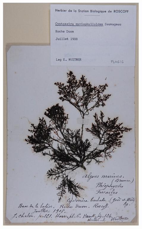 Collections : Station Biologique de RoscoffTypologie : HerbierDomaine : BotaniqueProvenance géographique : FinistèreIdentification du spécimen : Cystoseira barbata