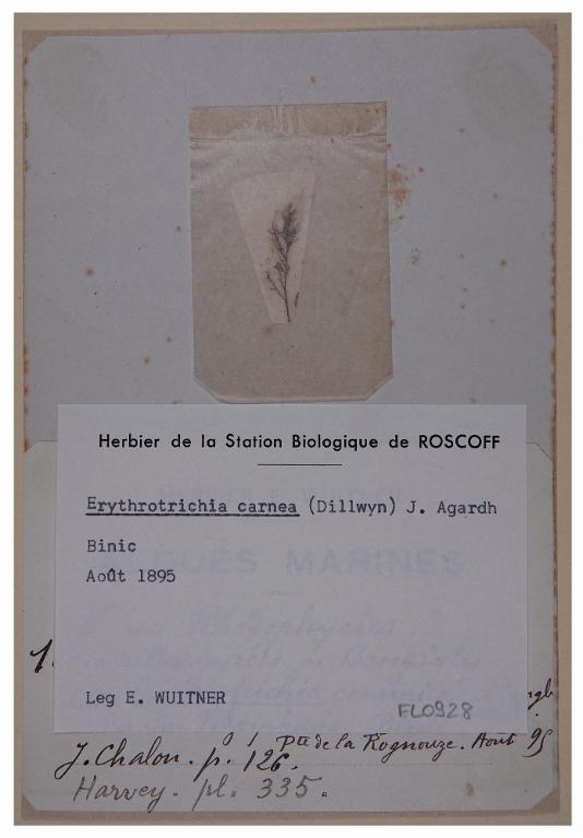 Collections : Station Biologique de RoscoffTypologie : HerbierIdentification du spécimen : Erythrotrichia ceramicolaDomaine : BotaniqueProvenance géographique : Binic